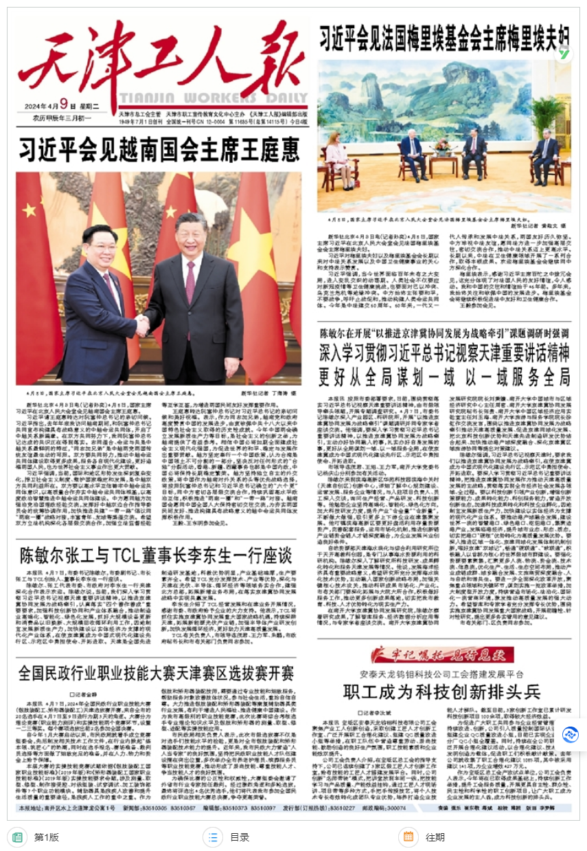 近日,《天津工人报》在头版刊登了安泰天龙钨钼科技公司工会搭建发展平台的先进事迹,原文如下: